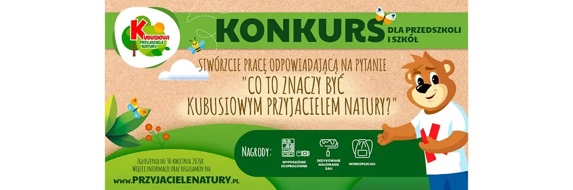 Uruchomiona w ramach programu rywalizacja konkursowa została zaprojektowana tak, aby realizować zasadę nauki poprzez zabawę, zaangażowanie i osobiste doświadczanie. Zadaniem konkursowym jest przygotowanie przez zespół uczniów odpowiedzi na pytanie: „Co znaczy być Kubusiowym Przyjacielem Natury?”. Forma jest dowolna i sprzyja autentycznej ekspresji najmłodszych – może to być mural, instalacja z materiałów naturalnych, mozaika z surowców wtórnych czy inna kreatywna dekoracja przestrzeni. Celem jest zmotywowanie najmłodszych do aktywnego poznawania zasad troski o środowisko, na których oparte są scenariusze poszczególnych lekcji programu „Kubusiowi Przyjaciele Natury”.