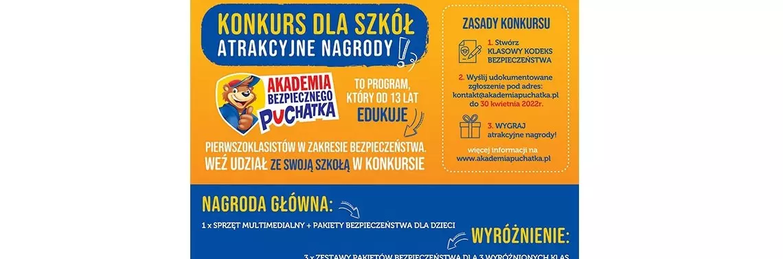 Pierwsze przekroczenie progu szkoły to ważny moment w życiu dziecka. Zdobywanie nowych umiejętności, reagowanie w nieznanych dotąd sytuacjach czy nawiązywanie relacji z rówieśnikami to jedne z wielu wyzwań, z którymi – prędzej czy później – mierzyć się będzie pierwszoklasista. Akademia Bezpiecznego Puchatka to program, którego celem jest przekazywanie najmłodszym wiedzy na temat zachowania bezpieczeństwa w różnych okolicznościach. Projekt jest skierowany do uczniów klas I szkól podstawowych i obejmuje tematykę związaną z bezpieczeństwem dzieci w pięciu strefach: na drodze, w domu, w szkole, w internecie, a także w relacji z rówieśnikami. W tym roku najmłodsi uczą się także empatii oraz radzenia sobie z emocjami. W projekcie oprócz pierwszoklasistów, mogą brać udział także uczniowie klas II, którzy w ubiegłym roku nie uczestniczyli w programie.