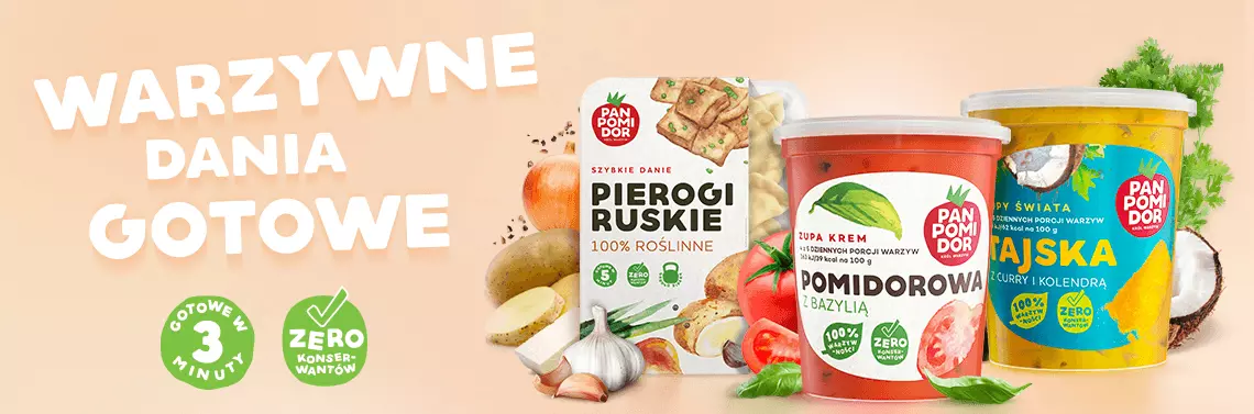 Jeśli nie wszystkich zadowoli zupa, to pierogi z warzywnym farszem marki Pan Pomidor mogą być smaczną odmianą. Smakosze mają do wyboru roślinne pierogi ruskie, z soczewicą i suszonymi pomidorami czy kapustą i podgrzybkami. Nawet najbardziej wybredny maluch znajdzie swojego faworyta i będzie się cieszył pysznym obiadem, także podczas nieobecności rodziców. Ci z kolei śmiało mogą zabrać do pracy bardziej egzotyczne wersje warzywnych pierogów, np. z dynią, jarmużem, quinoą i kolendrą. Trzeba je tylko podgrzać w mikrofalówce i lunch gotowy.